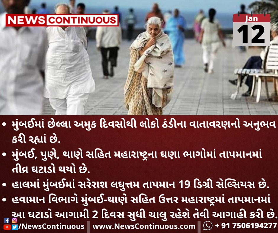 હવામાન વિભાગે મુંબઈ-થાણે સહિત ઉત્તર મહારાષ્ટ્રમાં તાપમાનમાં આ ઘટાડો આગામી બે દિવસ સુધી ચાલુ રહેશે તેવી આગાહી કરી છે.