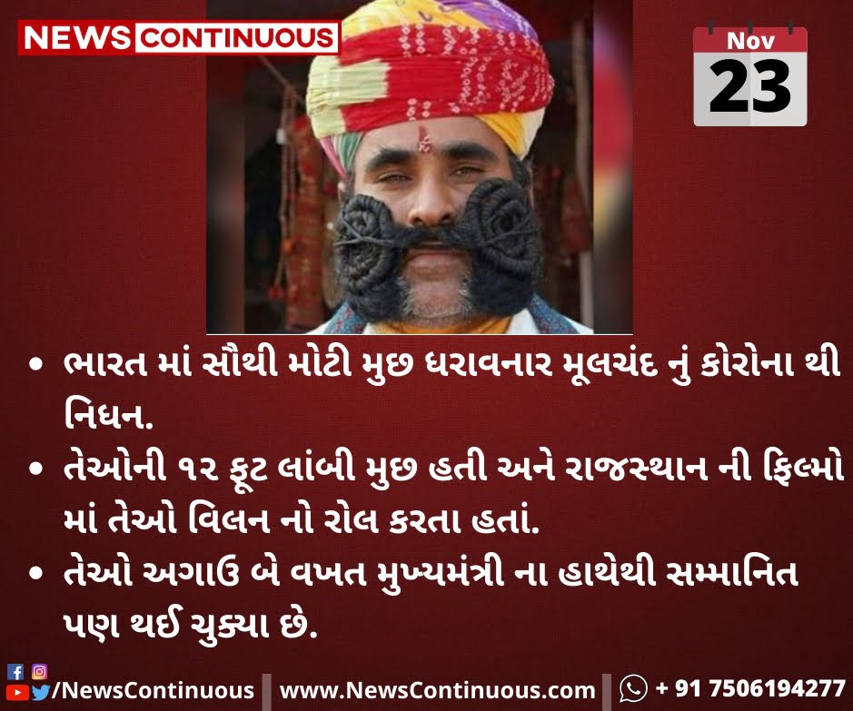 અરેરેરે… હજી કોને કોને ભરખી જશે કોરોના?? ભારત માં સૌથી મોટી મુછ ધરાવનાર મૂલચંદ નું નિધન. જાણો શી રીતે નિધન થયું અને કેટલી લાંબી હતી તેમની મુછો…..
