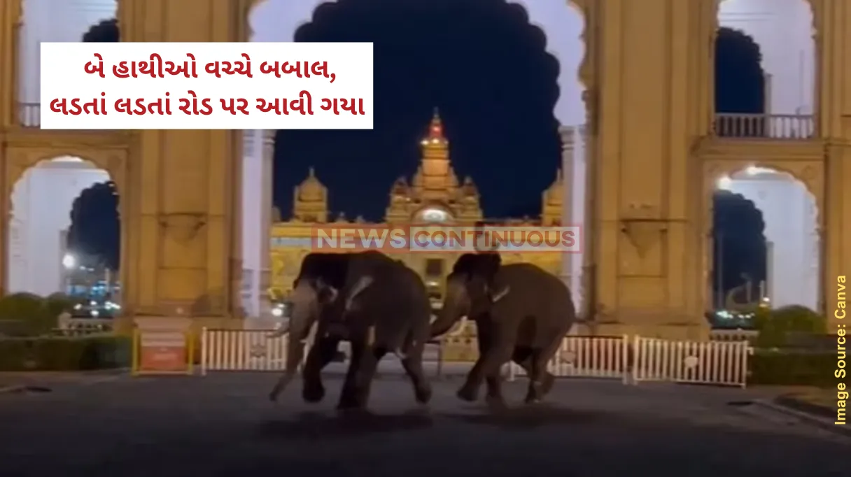 Elephant fight video :મૈસુરના પ્રખ્યાત દશેરા તહેવાર દરમિયાન એક ગંભીર ઘટના પ્રકાશમાં આવી છે. અહીં દશેરા ઉત્સવમાં ભાગ લઈ રહેલા બે હાથી કાંજન અને ધનંજય જમતી વખતે એકબીજા સાથે અથડાયા હતા. આ ઘટના મૈસૂર પેલેસ સંકુલમાં બની હતી, જેના કારણે ત્યાં હાજર લોકોમાં ગભરાટ ફેલાયો હતો. પેલેસ માં અચાનક હંગામો મચી ગયો, જ્યારે ધનંજયે આક્રમક રીતે કંજન પર હુમલો કર્યો, જેના કારણે કંજને પેલેસ ના પરિસરમાંથી ભાગવાનો પ્રયાસ કર્યો.