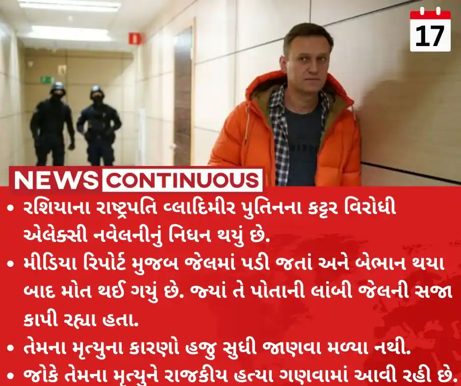 - રશિયાના રાષ્ટ્રપતિ વ્લાદિમીર પુતિનના કટ્ટર વિરોધી એલેક્સી નવેલનીનું જેલમાં નિધન થઇ ગયું છે.
