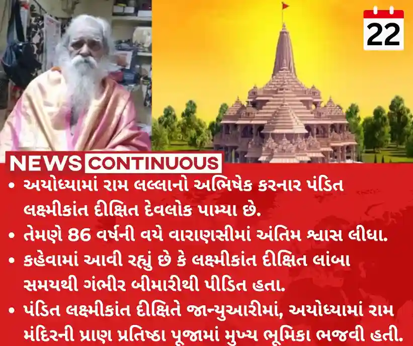 - અયોધ્યામાં રામ લલ્લાનો અભિષેક કરનાર પંડિત લક્ષ્મીકાંત દીક્ષિત દેવલોક પામ્યા છે.
