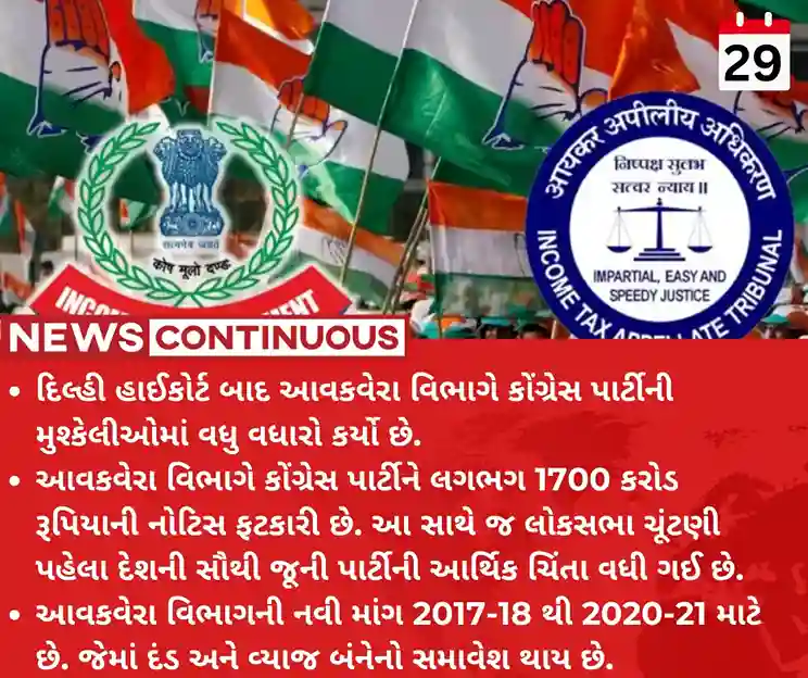 - દિલ્હી હાઈકોર્ટ બાદ આવકવેરા વિભાગે કોંગ્રેસ પાર્ટીની મુશ્કેલીઓમાં વધુ વધારો કર્યો છે.