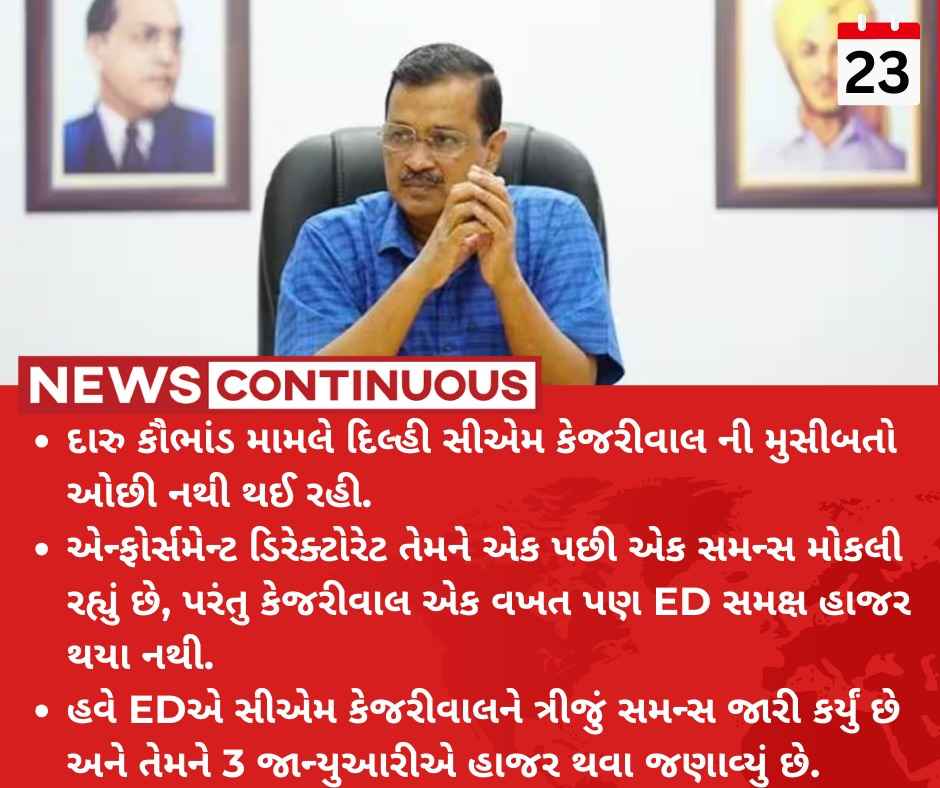 • હવે EDએ સીએમ કેજરીવાલને ત્રીજું સમન્સ જારી કર્યું છે અને તેમને 3 જાન્યુઆરીએ હાજર થવા જણાવ્યું છે.