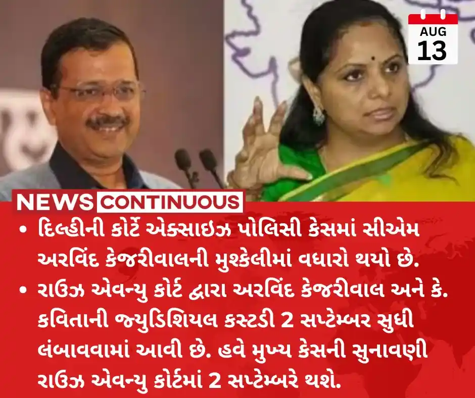 • રાઉઝ એવન્યુ કોર્ટ દ્વારા અરવિંદ કેજરીવાલ અને કે. કવિતાની જ્યુડિશિયલ કસ્ટડી 2 સપ્ટેમ્બર સુધી લંબાવવામાં આવી છે.