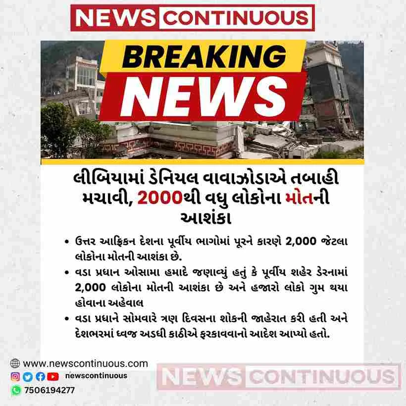 - ઉત્તર આફ્રિકન દેશના પૂર્વીય ભાગોમાં પૂરને કારણે 2,000 જેટલા લોકોના મોતની આશંકા છે.