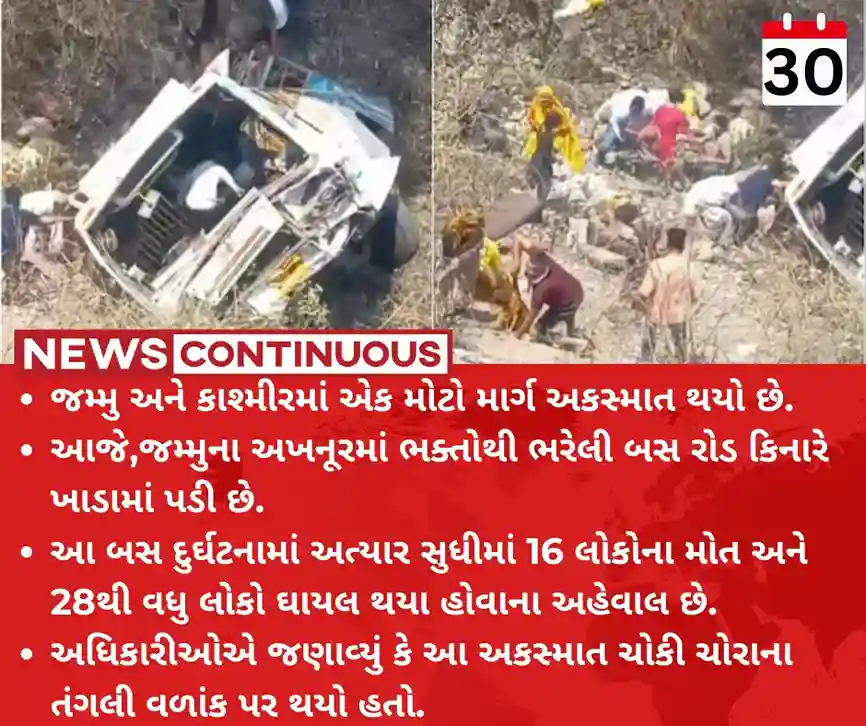 - આજે,જમ્મુના અખનૂરમાં ભક્તોથી ભરેલી બસ રોડ કિનારે ખાડામાં પડી છે.
