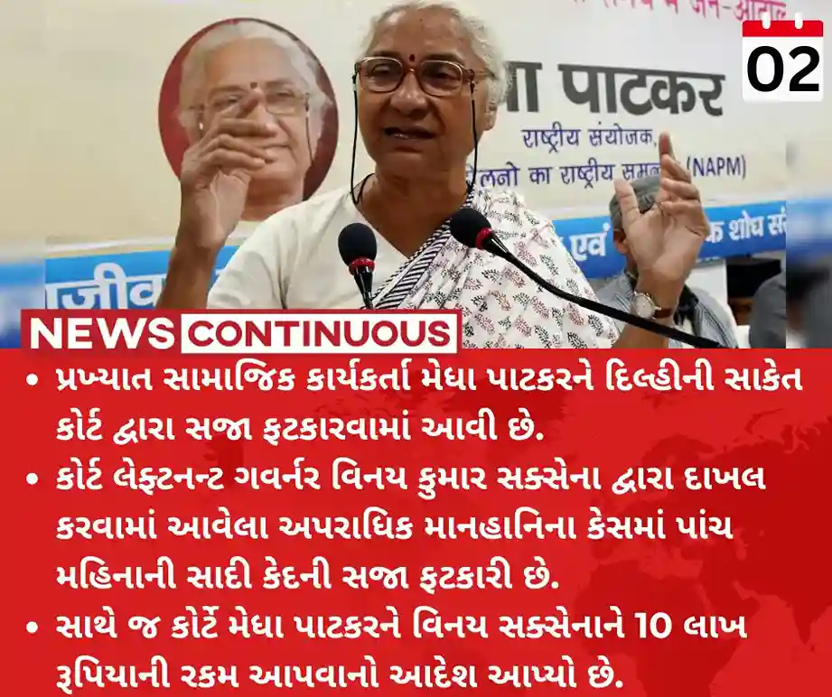 - પ્રખ્યાત સામાજિક કાર્યકર્તા મેધા પાટકરને દિલ્હીની સાકેત કોર્ટ દ્વારા સજા ફટકારવામાં આવી છે.
