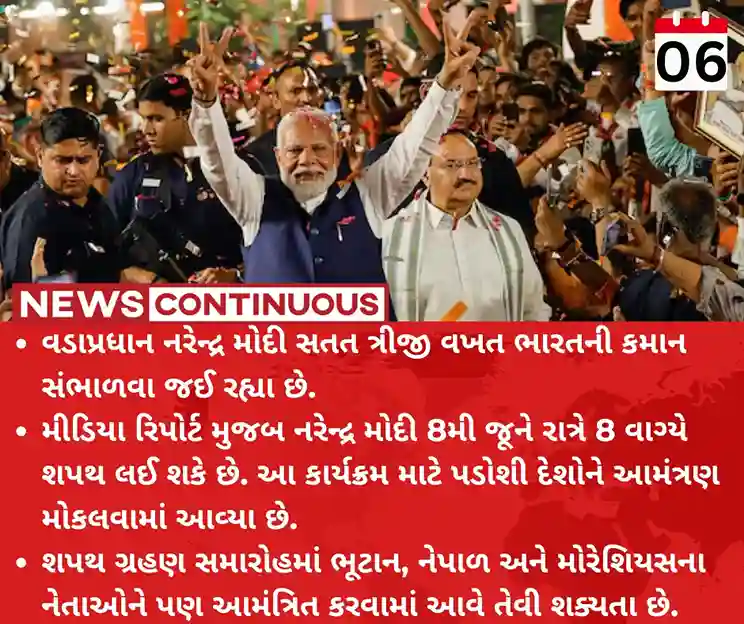 • મીડિયા રિપોર્ટ મુજબ નરેન્દ્ર મોદી 8મી જૂને રાત્રે 8 વાગ્યે શપથ લઈ શકે છે. આ કાર્યક્રમ માટે પડોશી દેશોને આમંત્રણ મોકલવામાં આવ્યા છે.