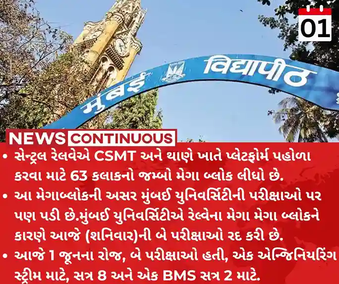 - મુંબઈ યુનિવર્સિટીએ રેલ્વેના મેગા મેગા બ્લોકને કારણે આજે (શનિવાર)ની બે પરીક્ષાઓ રદ કરી છે.