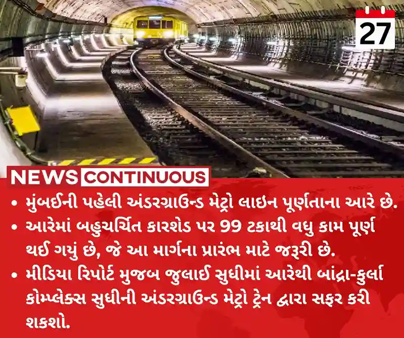 - મીડિયા રિપોર્ટ મુજબ જુલાઈ સુધીમાં આરેથી બાંદ્રા-કુર્લા કોમ્પ્લેક્સ સુધીની અંડરગ્રાઉન્ડ મેટ્રો ટ્રેન દ્વારા સફર કરી શકશો