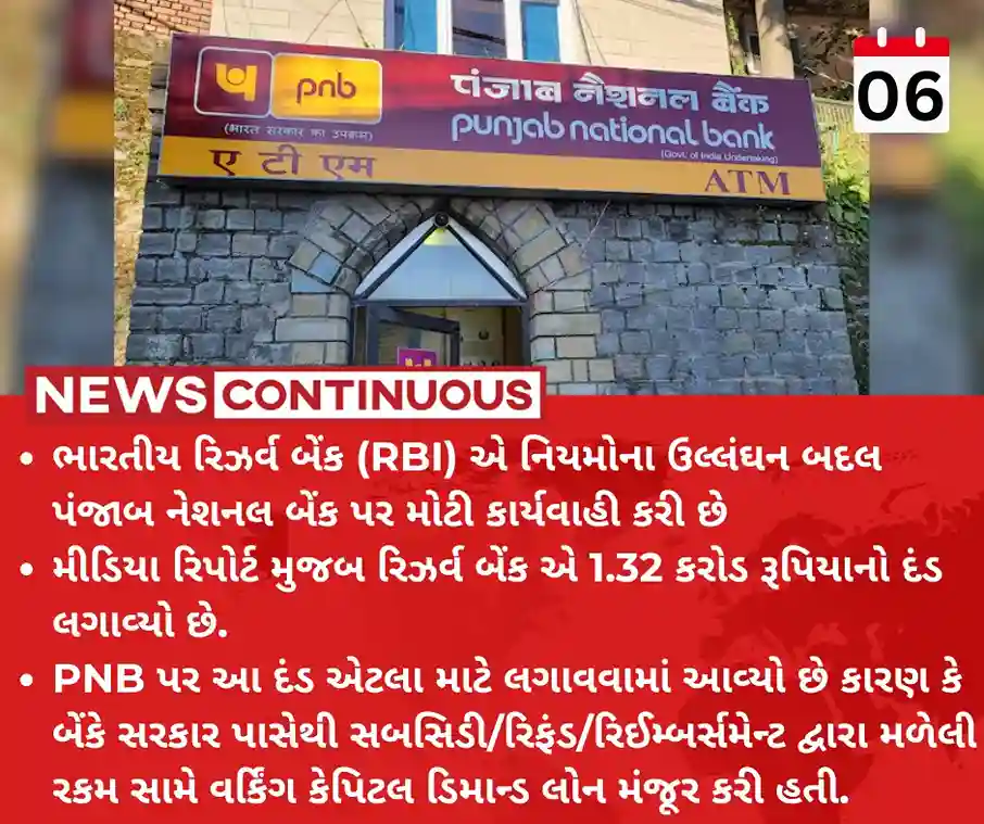 - ભારતીય રિઝર્વ બેંક (RBI) એ નિયમોના ઉલ્લંઘન બદલ પંજાબ નેશનલ બેંક પર મોટી કાર્યવાહી કરી છે