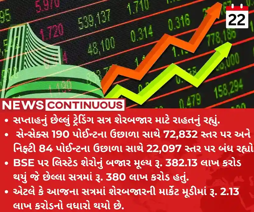 - આજના કારોબારના અંતે સેન્સેક્સ 190 પોઈન્ટના ઉછાળા સાથે 72,832 સ્તર પર અને નિફ્ટી 84 પોઈન્ટના ઉછાળા સાથે 22,097 સ્તર પર બંધ રહ્યો છે.