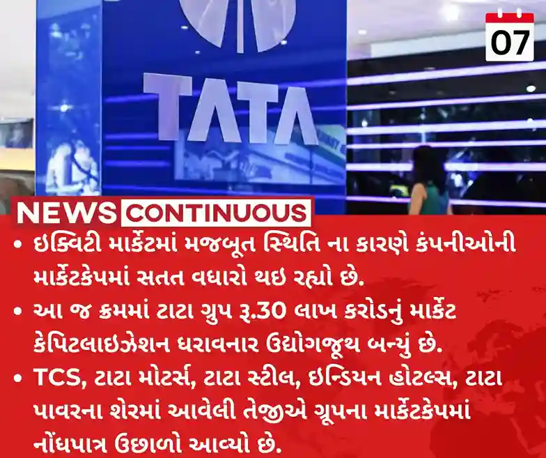 - આ જ ક્રમમાં ટાટા ગ્રુપ રૂ.30 લાખ કરોડનું માર્કેટ કેપિટલાઇઝેશન ધરાવનાર ઉદ્યોગજૂથ બન્યું છે.
