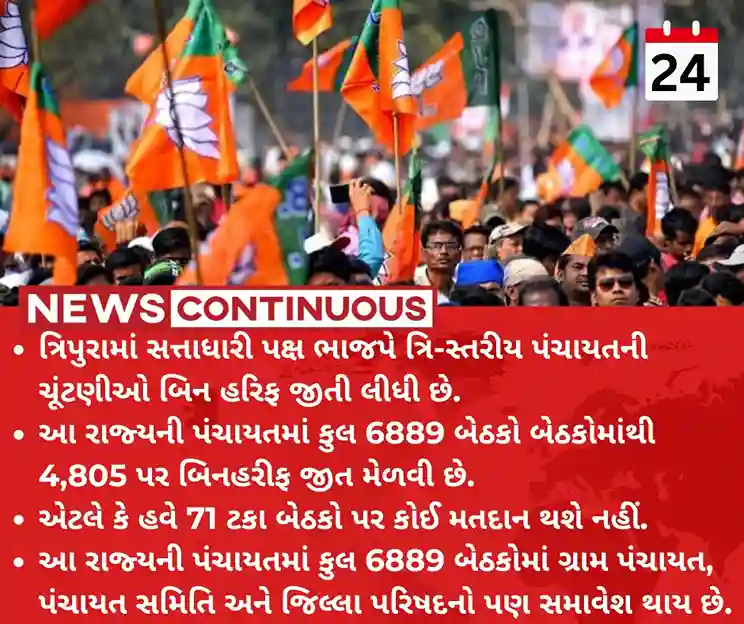 - ત્રિપુરામાં સત્તાધારી પક્ષ ભાજપે ત્રિ-સ્તરીય પંચાયતની ચૂંટણીઓ બિન હરિફ જીતી લીધી છે.