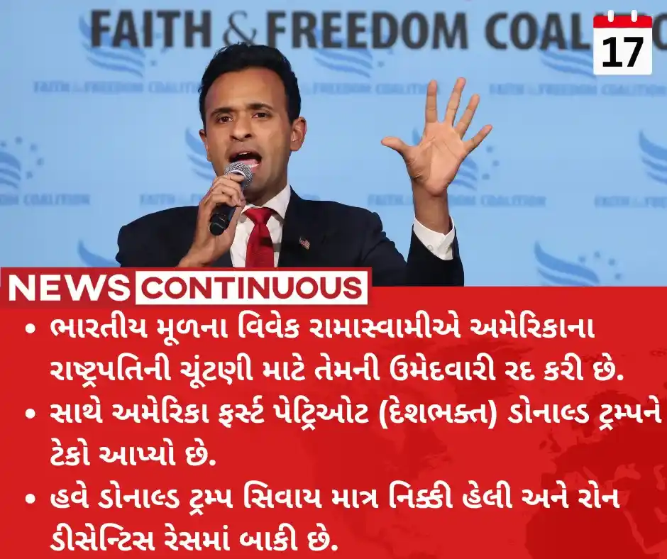 - ભારતીય મૂળના વિવેક રામાસ્વામીએ અમેરિકાના રાષ્ટ્રપતિની ચૂંટણી માટે તેમની ઉમેદવારી રદ કરી છે.