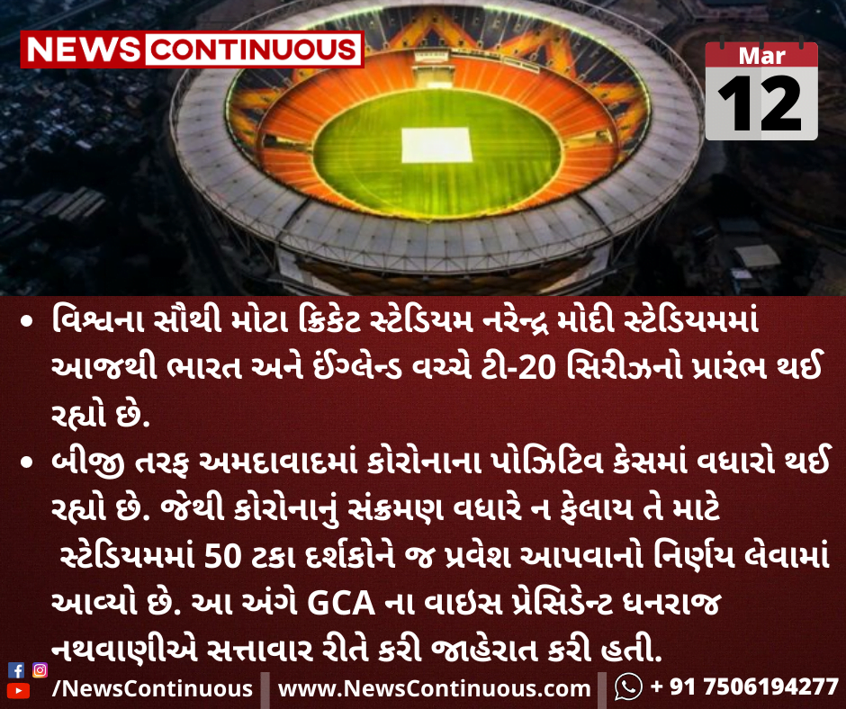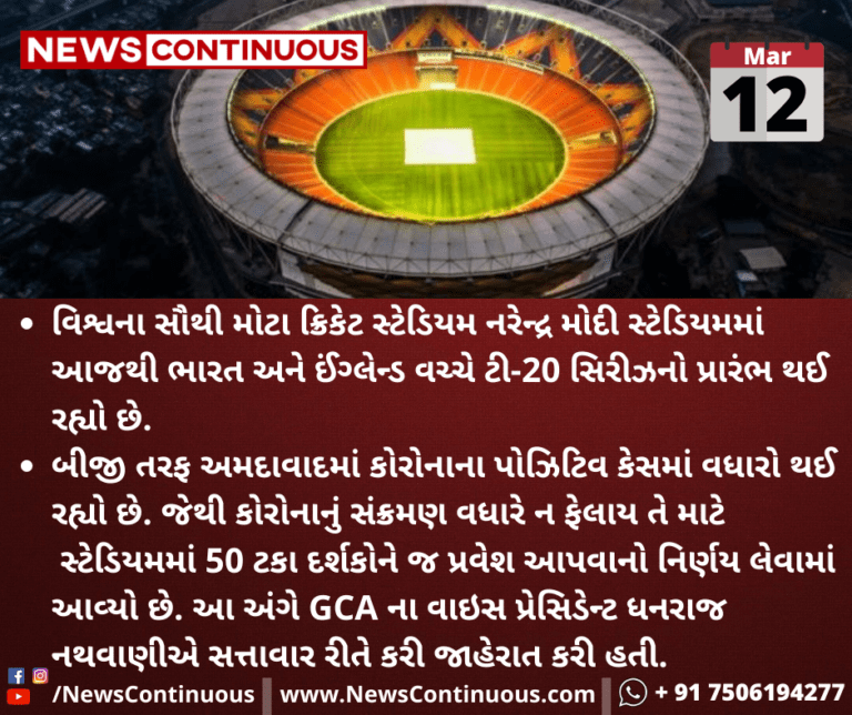 બીજી તરફ અમદાવાદમાં કોરોનાના પોઝિટિવ કેસમાં વધારો થઈ રહ્યો છે. જેથી કોરોનાનું સંક્રમણ વધારે ન ફેલાય તે માટે સ્ટેડિયમમાં 50 ટકા દર્શકોને જ પ્રવેશ આપવાનો નિર્ણય લેવામાં આવ્યો છે.