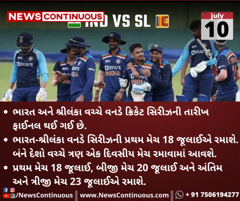 ભારત-શ્રીલંકા વનડે સિરીઝની પ્રથમ મેચ 18 જૂલાઈએ રમાશે. બંને દેશો વચ્ચે ત્રણ એક દિવસીય મેચ રમાવામાં આવશે.