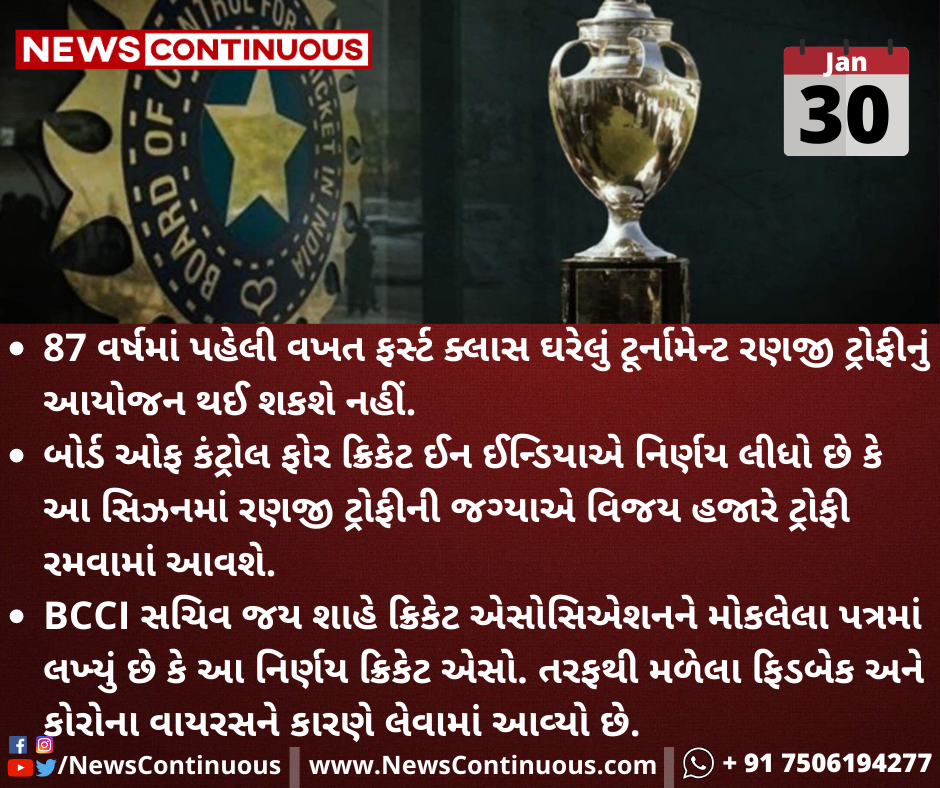 87 વર્ષમાં પહેલી વખત ફર્સ્ટ ક્લાસ ઘરેલું ટૂર્નામેન્ટ રણજી ટ્રોફીનું આયોજન થઈ શકશે નહીં