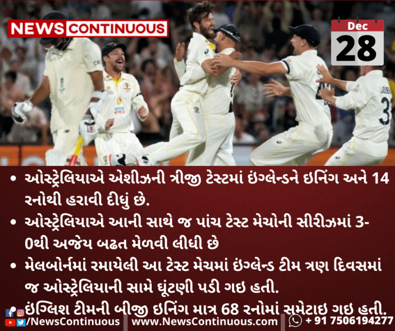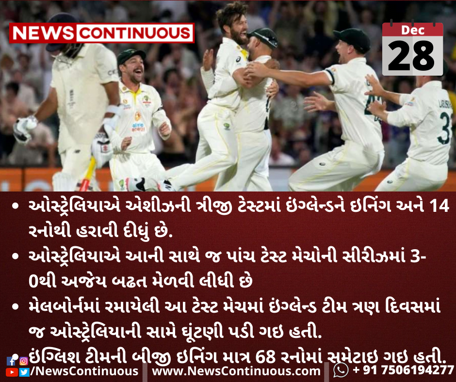 ઓસ્ટ્રેલિયાએ એશીઝની ત્રીજી ટેસ્ટમાં ઇંગ્લેન્ડને ઇનિંગ અને 14 રનોથી હરાવી દીધું છે.