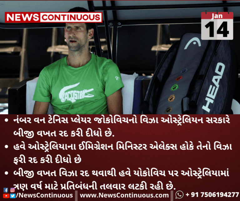 નંબર વન ટેનિસ પ્લેયર જોકોવિચનો વિઝા ઓસ્ટ્રેલિયન સરકારે બીજી વખત રદ કરી દીધો છે.