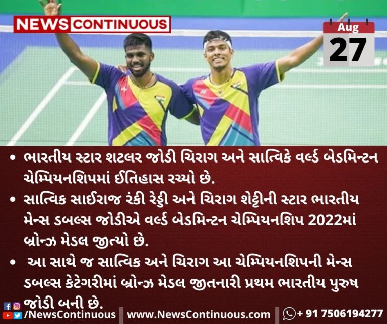 સાત્વિક સાઈરાજ રંકી રેડ્ડી(Satvik Sairaj Ranki Reddy) અને ચિરાગ શેટ્ટીની(Chirag Shetty) સ્ટાર ભારતીય મેન્સ ડબલ્સ જોડીએ(Indian Men's Doubles Pair) વર્લ્ડ બેડમિન્ટન ચેમ્પિયનશિપ 2022માં બ્રોન્ઝ મેડલ(Bronze medal) જીત્યો છે