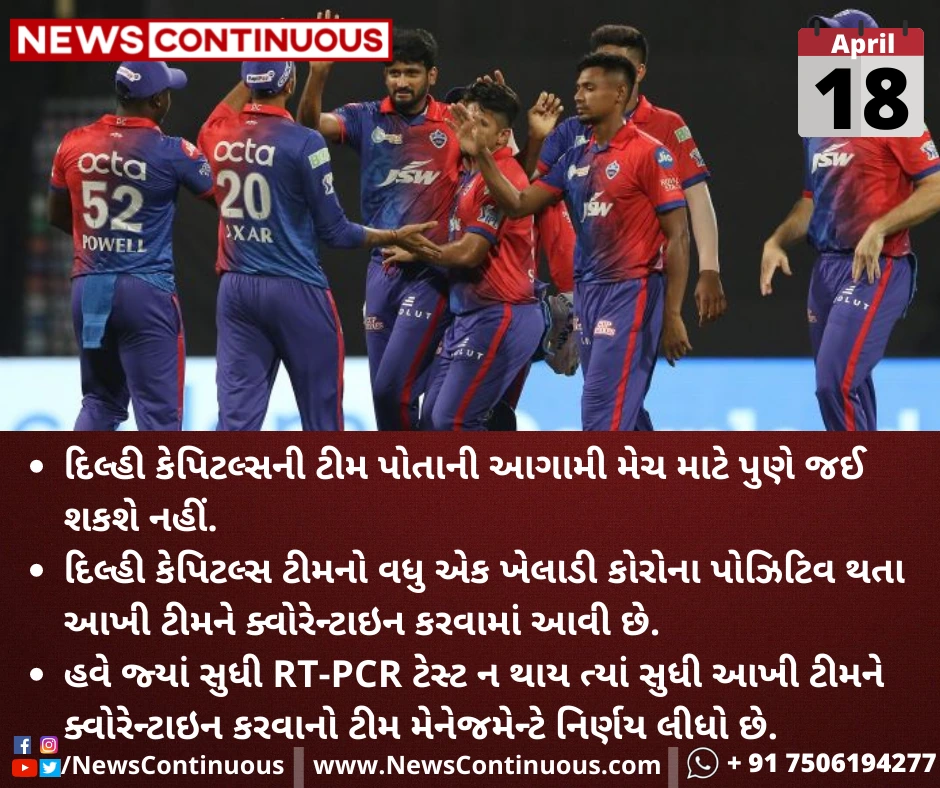 દિલ્હી કેપિટલ્સ ટીમનો વધુ એક ખેલાડી(cricketer) કોરોના પોઝિટિવ(Covid positive) થતા આખી ટીમને ક્વોરેન્ટાઇન(Quarantine) કરવામાં આવી છે.