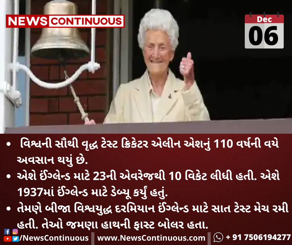 વિશ્વની સૌથી વૃદ્ધ ટેસ્ટ ક્રિકેટર એલીન એશનું 110 વર્ષની વયે અવસાન થયું છે.