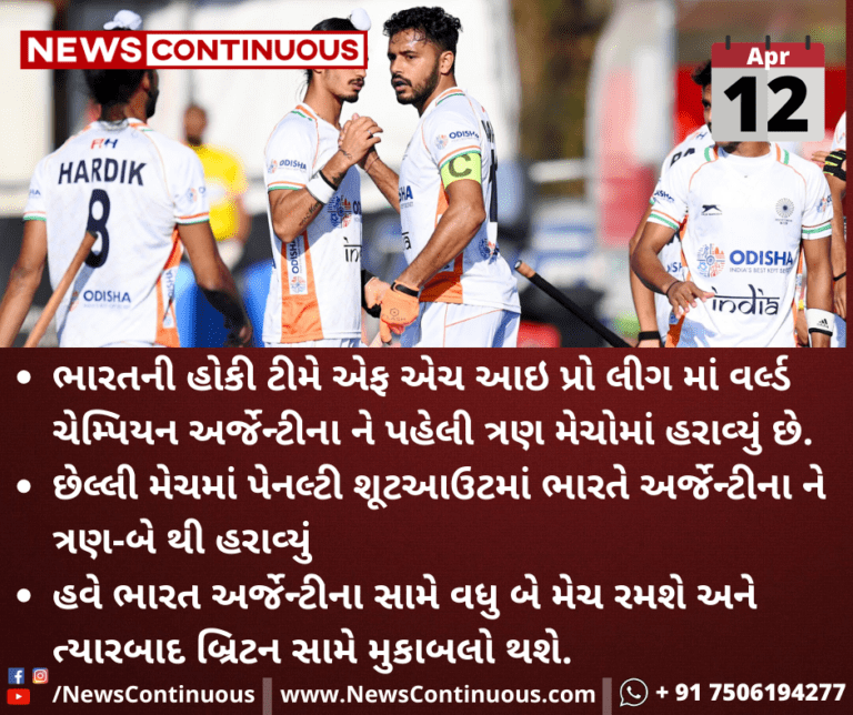 ભારતની હોકી ટીમે એફ એચ આઇ પ્રો લીગ માં વર્લ્ડ ચેમ્પિયન અર્જેન્ટીના ને પહેલી ત્રણ મેચોમાં હરાવ્યું છે.