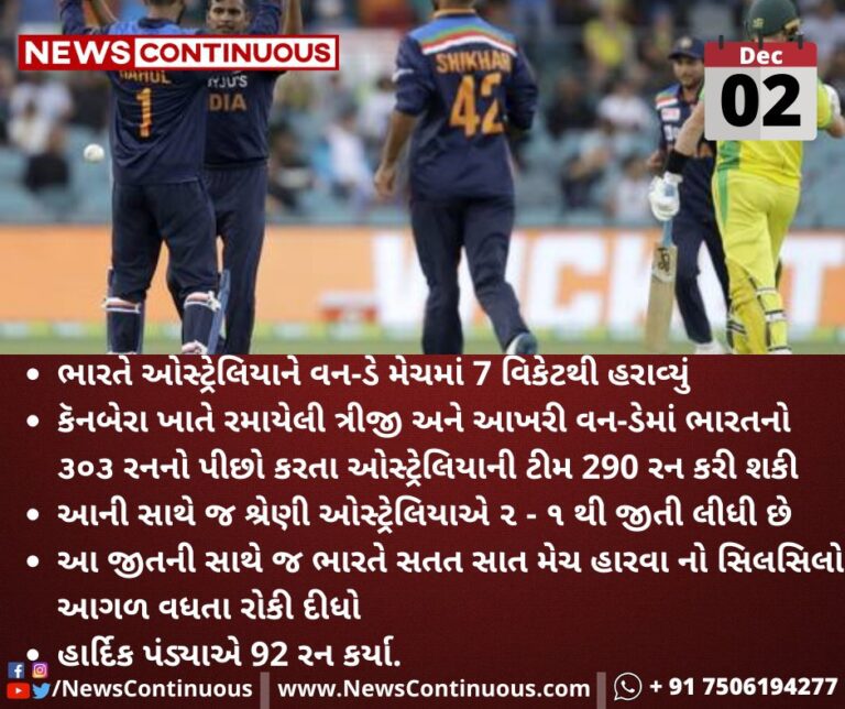 ભારતે ઓસ્ટ્રેલિયાને વન-ડે મેચમાં 7 વિકેટથી હરાવ્યું. આ જીતની સાથે જ ભારતે સતત સાત મેચ હારવા નો સિલસિલો આગળ વધતા રોકી દીધો. જાણો વિગત…