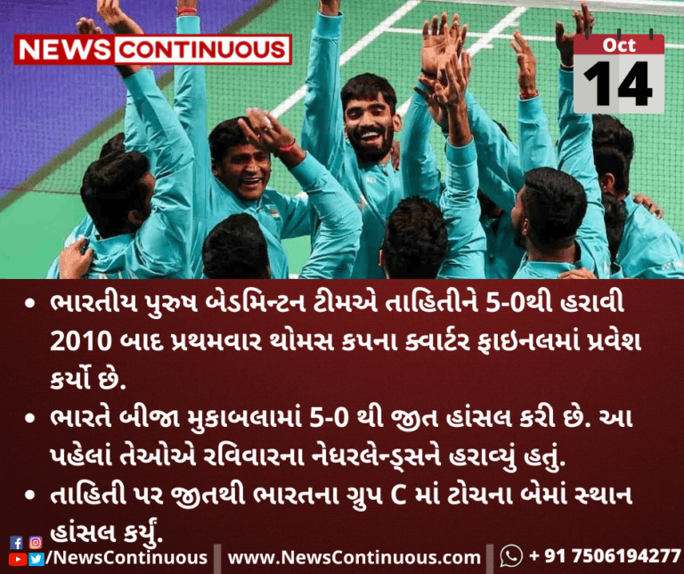 ભારતીય પુરુષ બેડમિન્ટન ટીમએ તાહિતીને 5-0થી હરાવી 2010 બાદ પ્રથમવાર થોમસ કપના ક્વાર્ટર ફાઇનલમાં પ્રવેશ કર્યો છે.