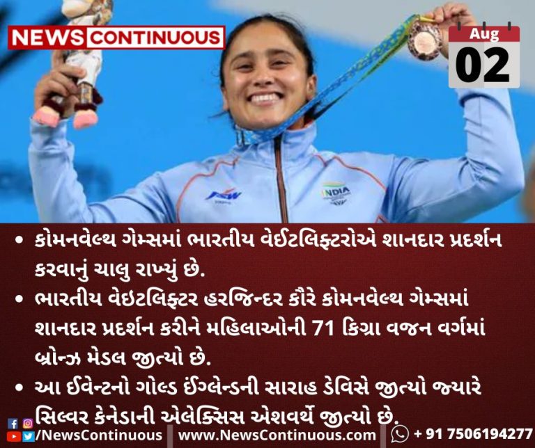 ભારતીય વેઇટલિફ્ટર હરજિન્દર કૌરે(Harjinder Kaur) કોમનવેલ્થ ગેમ્સમાં શાનદાર પ્રદર્શન કરીને મહિલાઓની 71 કિગ્રા વજન વર્ગમાં બ્રોન્ઝ મેડલ(Bronze Medal) જીત્યો છે.