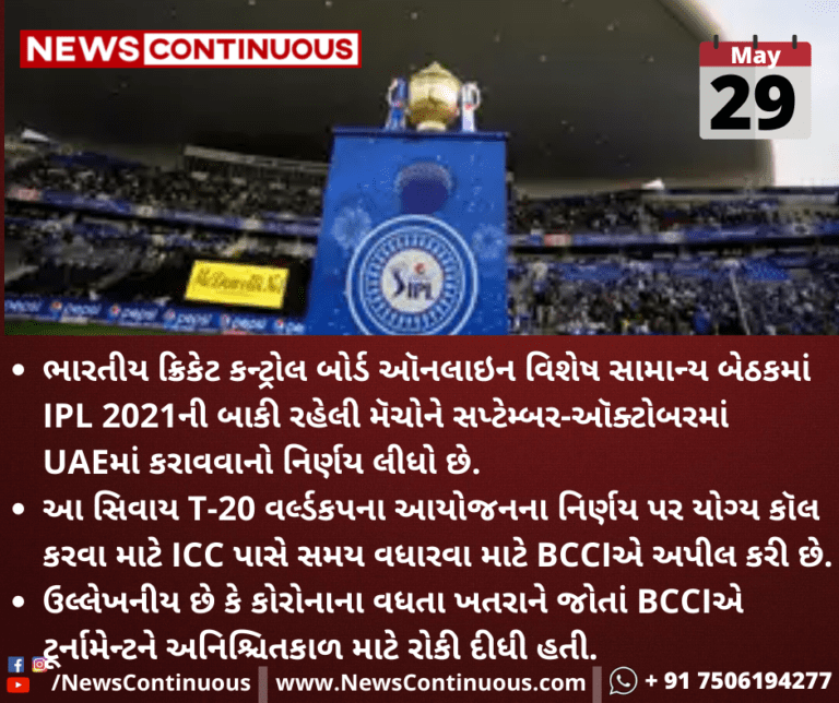 ભારતીય ક્રિકેટ કન્ટ્રોલ બોર્ડ ઑનલાઇન વિશેષ સામાન્ય બેઠકમાં IPL 2021ની બાકી રહેલી મૅચોને સપ્ટેમ્બર-ઑક્ટોબરમાં UAEમાં કરાવવાનો નિર્ણય લીધો છે.