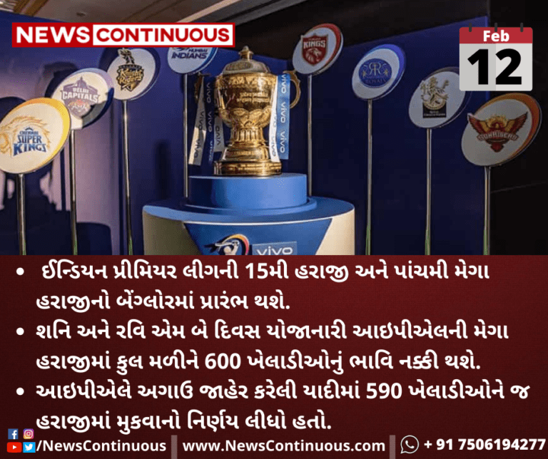 ઈન્ડિયન પ્રીમિયર લીગની 15મી હરાજી અને પાંચમી મેગા હરાજીનો બેંગ્લોરમાં પ્રારંભ થશે.