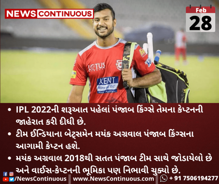 ટીમ ઈન્ડિયાના બેટ્સમેન મયંક અગ્રવાલ પંજાબ કિંગ્સના આગામી કેપ્ટન હશે.