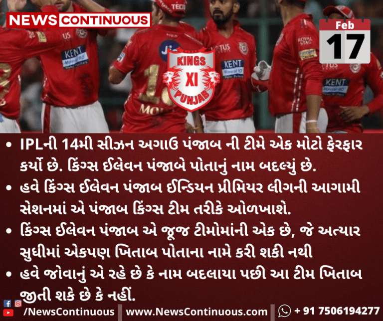 IPL ની14મી સીઝન અગાઉ પંજાબ ની ટીમે એક મોટો ફેરફાર કર્યો છે. કિંગ્સ ઈલેવન પંજાબે પોતાનું નામ બદલ્યું છે