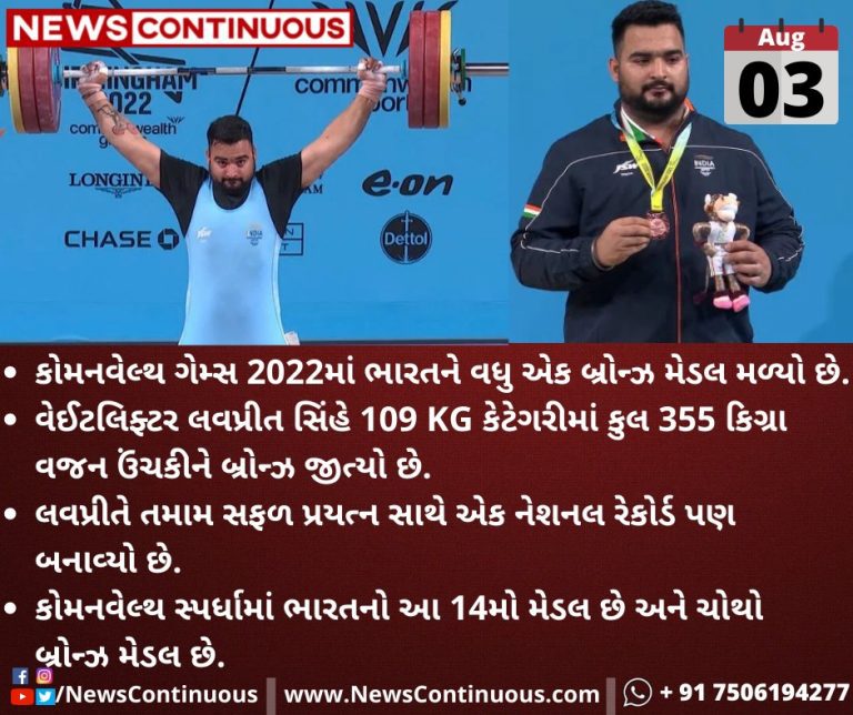વેઈટલિફ્ટર(Weightlifter) લવપ્રીત સિંહે(Lovepreet Singh) 109 KG કેટેગરીમાં કુલ 355 કિગ્રા વજન ઉંચકીને(Weightlifting) બ્રોન્ઝ જીત્યો છે.