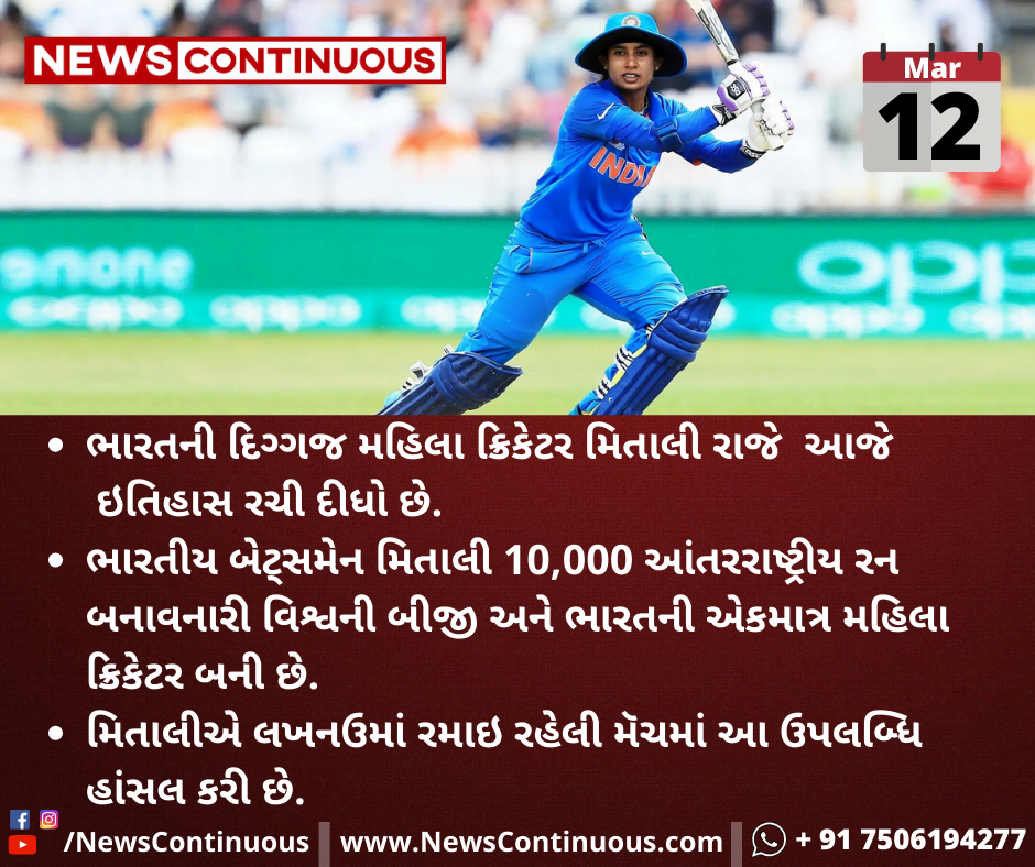 ભારતીય બેટ્સમેન મિતાલી 10,000 આંતરરાષ્ટ્રીય રન બનાવનારી વિશ્વની બીજી અને ભારતની એકમાત્ર મહિલા ક્રિકેટર બની છે.