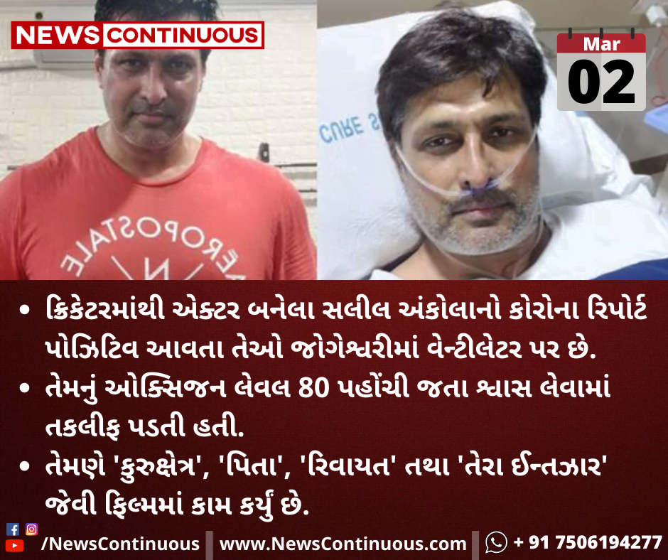 ક્રિકેટરમાંથી એક્ટર બનેલા સલીલ અંકોલાનો કોરોના રિપોર્ટ પોઝિટિવ આવતા તેઓ જોગેશ્વરીમાં વેન્ટીલેટર પર છે.