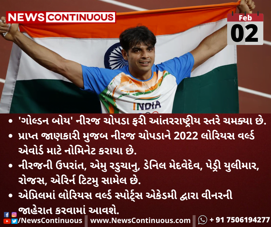 પ્રાપ્ત જાણકારી મુજબ નીરજ ચોપડાને 2022 લોરિયસ વર્લ્ડ એવોર્ડ માટે નોમિનેટ કરાયા છે.