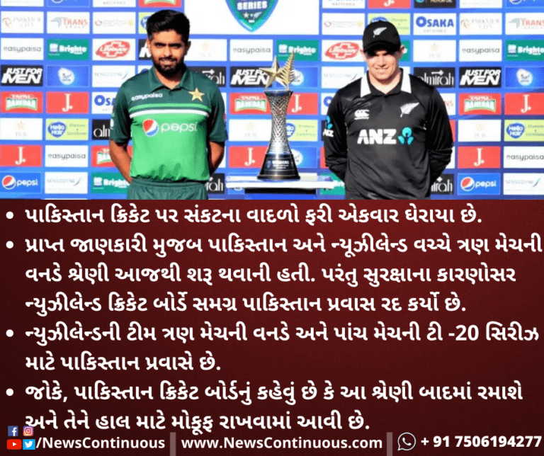 પ્રાપ્ત જાણકારી મુજબ પાકિસ્તાન અને ન્યૂઝીલેન્ડ વચ્ચે ત્રણ મેચની વનડે શ્રેણી આજથી શરૂ થવાની હતી. પરંતુ સુરક્ષાના કારણોસર ન્યુઝીલેન્ડ ક્રિકેટ બોર્ડે સમગ્ર પાકિસ્તાન પ્રવાસ રદ કર્યો છે.