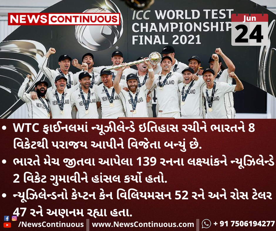 WTC ફાઈનલમાં ન્યૂઝીલેન્ડે ઇતિહાસ રચીને ભારતને 8 વિકેટથી પરાજય આપીને વિજેતા બન્યું છે.
