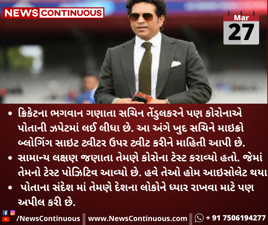 - ક્રિકેટના ભગવાન ગણાતા સચિન તેંડુલકરને પણ કોરોનાએ પોતાની ઝપેટમાં લઈ લીધા છે. આ અંગે ખુદ સચિને માઇક્રો બ્લોગિંગ સાઇટ ટ્વીટર ઉપર ટ્વીટ કરીને માહિતી આપી છે.