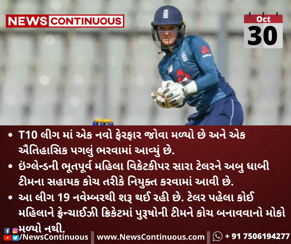 ઇંગ્લેન્ડની ભૂતપૂર્વ મહિલા વિકેટકીપર સારા ટેલરને અબુ ધાબી ટીમના સહાયક કોચ તરીકે નિયુક્ત કરવામાં આવી છે.
