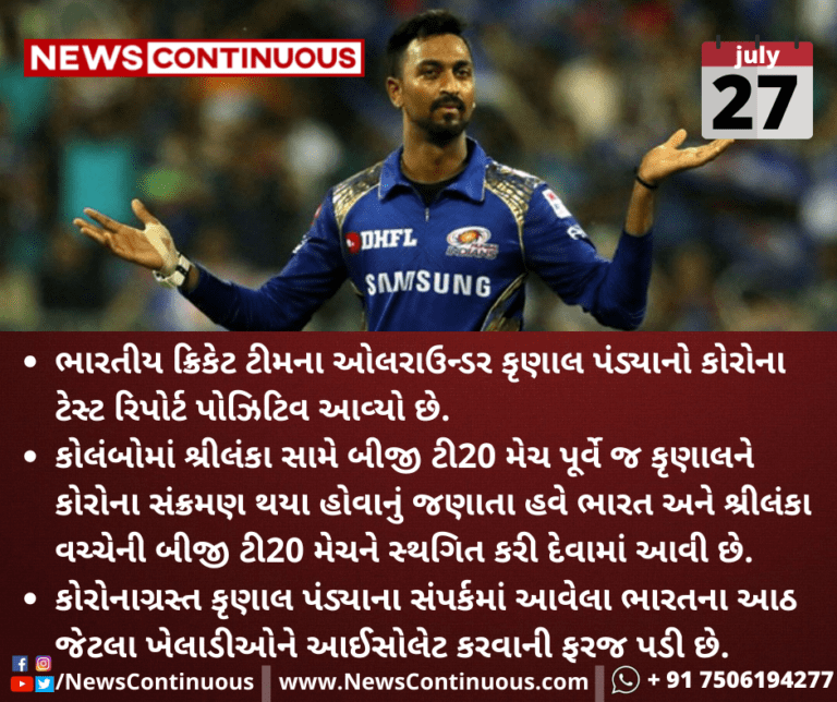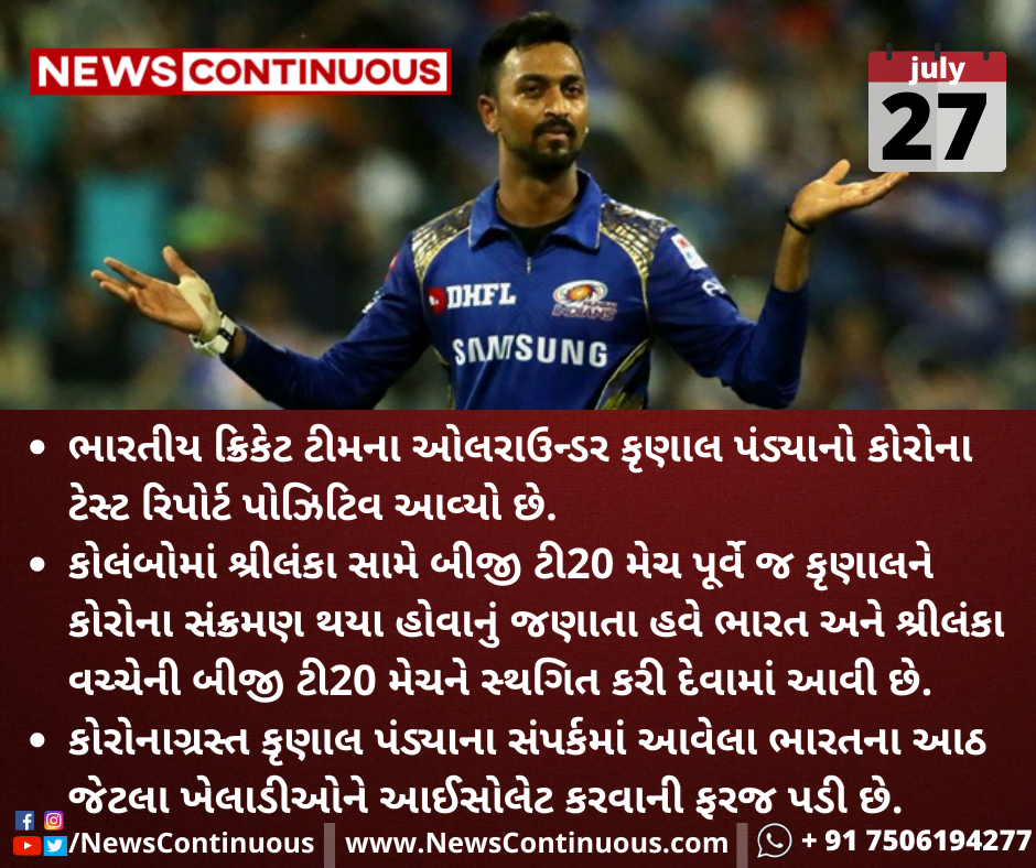 કોલંબોમાં શ્રીલંકા સામે બીજી ટી20 મેચ પૂર્વે જ કૃણાલને કોરોના સંક્રમણ થયા હોવાનું જણાતા હવે ભારત અને શ્રીલંકા વચ્ચેની બીજી ટી20 મેચને સ્થગિત કરી દેવામાં આવી છે.