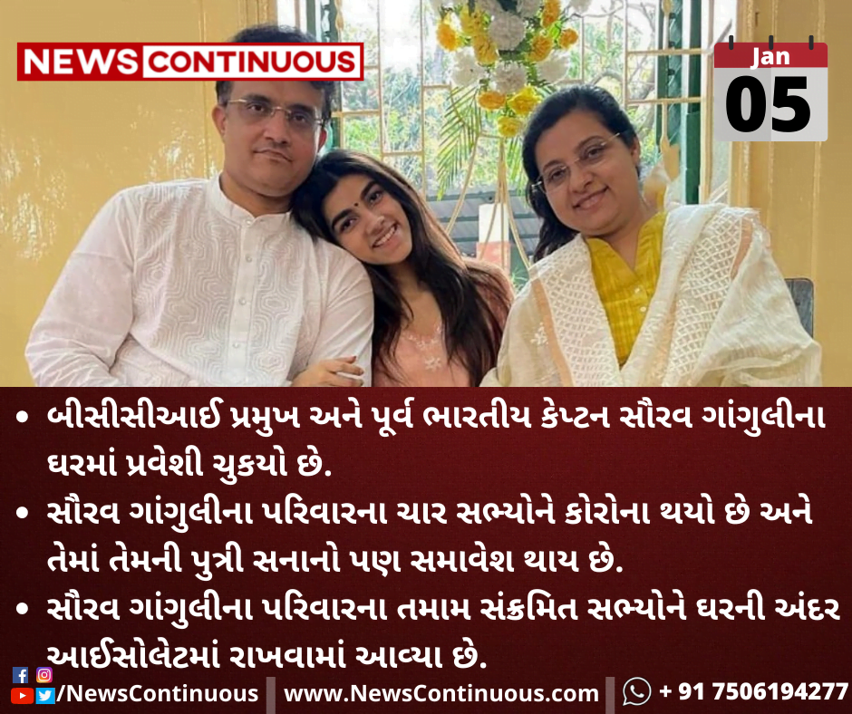 ગાંગુલીના પરિવારના ચાર સભ્યોને કોરોના થયો છે અને તેમાં તેમની પુત્રી સનાનો પણ સમાવેશ થાય છે.