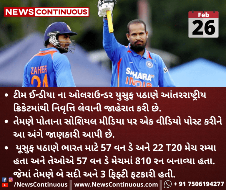 ટીમ ઈન્ડીયા ના ઓલરાઉન્ડર યુસુફ પઠાણે આંતરરાષ્ટ્રીય ક્રિકેટમાંથી નિવૃત્તિ લેવાની જાહેરાત કરી છે. તેણે પોતાના સોશિયલ મીડિયા પર એક વીડિયો પોસ્ટ કરીને આ અંગે જાણકારી આપી છે.
