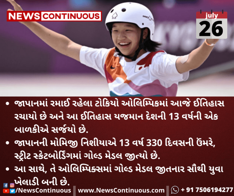 જાપાનની મોમિજી નિશીયાએ 13 વર્ષ 330 દિવસની ઉંમરે, સ્ટ્રીટ સ્કેટબોર્ડિંગમાં ગોલ્ડ મેડલ જીત્યો છે.