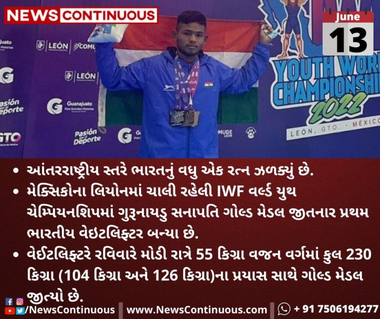મેક્સિકોના(Mexico) લિયોનમાં(Lyon) ચાલી રહેલી IWF વર્લ્ડ યુથ ચેમ્પિયનશિપમાં(World Youth Championship) ગુરૂનાયડુ સનાપતિ(Gurunaidu Sanapati) ગોલ્ડ મેડલ(Gold medal) જીતનાર પ્રથમ ભારતીય વેઇટલિફ્ટર(first Indian weightlifter) બન્યા છે.