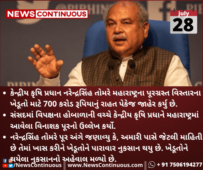 કેન્દ્રીય કૃષિ પ્રધાન નરેન્દ્રસિંહ તોમરે મહારાષ્ટ્રના પૂરગ્રસ્ત વિસ્તારના ખેડૂતો માટે 700 કરોડ રૂપિયાનું રાહત પેકેજ જાહેર કર્યુ છે.
