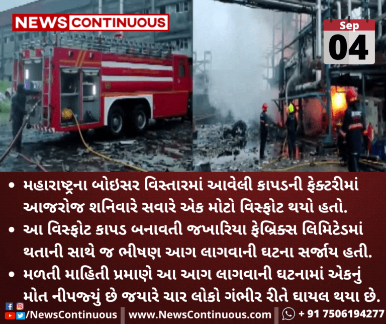 મહારાષ્ટ્રના બોઇસર વિસ્તારમાં આવેલી કાપડની ફેક્ટરીમાં આજરોજ શનિવારે સવારે એક મોટો વિસ્ફોટ થયો હતો.